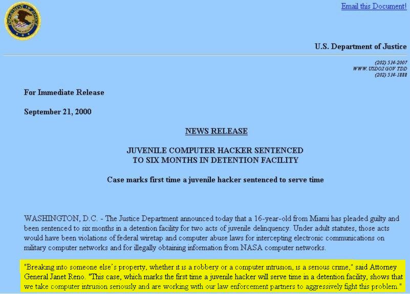 ATTORNEY GENERAL JANET RENO PROSECUTED A 16 yr OLD HACKER IN MIAMI, FLORIDA (click here), AND HE WAS SENTENCED TO SIX MONTHS IN PRISON.